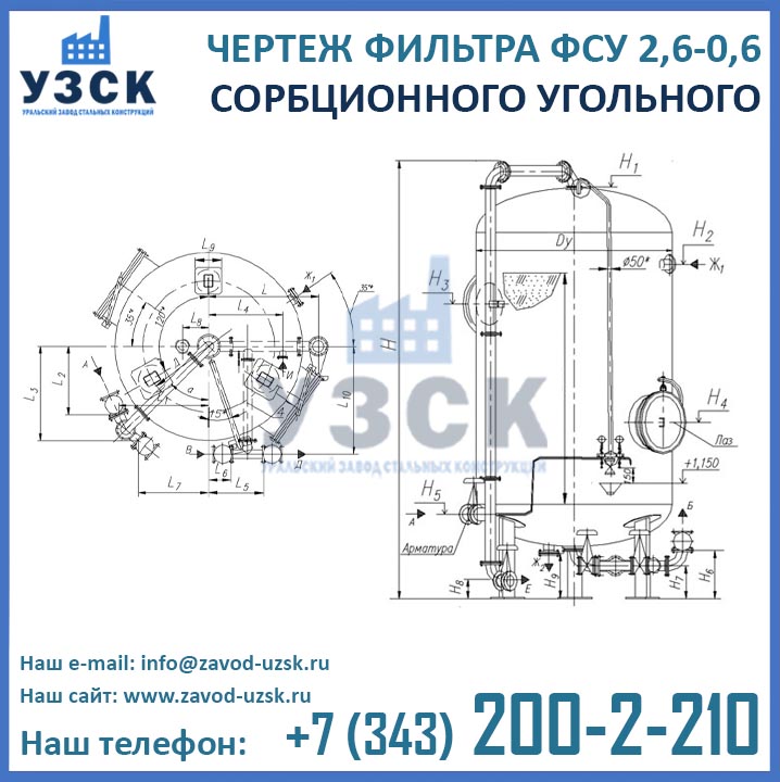 Изготовление сорбционных угольных фильтров ФСУ 2,6-0,6 в Саранске осуществляется из стали. Корпус аппарата представляет собой цилиндрическую обечайку из стального листа с приваренными к ней сверху и снизу штампованными днищами эллиптической формы. Для монтажа на фундамент, фильтр оснащен тремя опорами. Для присоединения трубопроводов обвязки в центре днищ имеются фланцы. Корпус аппарата снабжен двумя люками-лазами, необходимыми для загрузки сорбента, осмотра, ремонта и обслуживания фильтра. Внутри фильтра расположены нижнее сборно-распределительное устройство (НРУ) и верхнее (ВРУ).